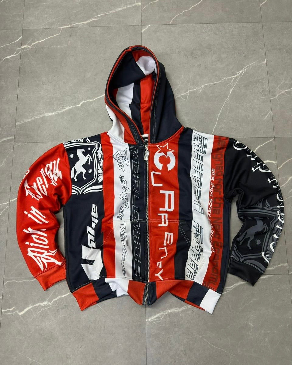 Heavyweight full-zip jacket with all-over Currency Overload graphics and a custom metal zipper pull. Built for pressure, movement, and late nights chasing something bigger than you.